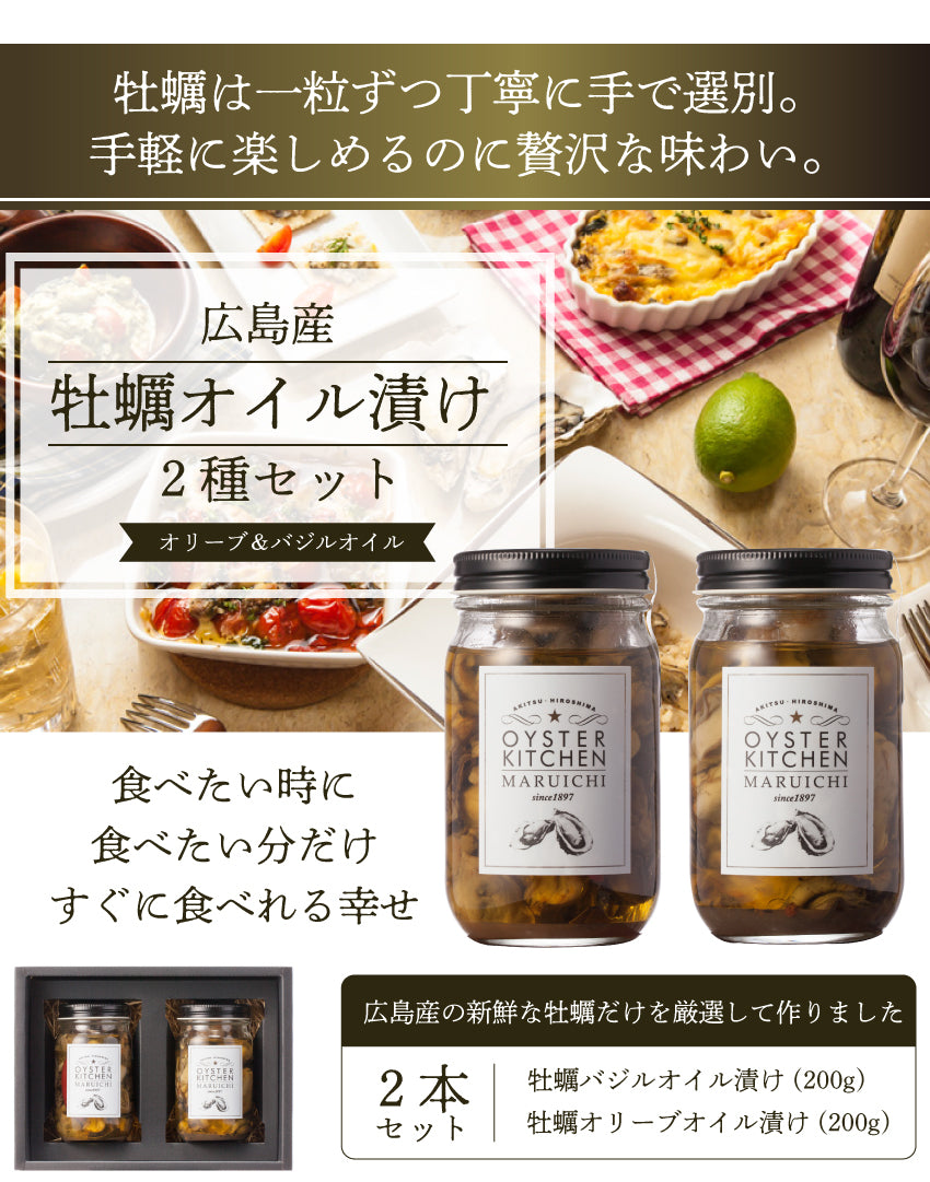 ■オリーブオイル漬け ・内容量:200g ・原材料:かき(広島産)、オリーブオイル、 白ワイン、醤油、オイスターソース ローリエ、唐辛子 (※原料の一部に、大豆・小麦を含む) ・賞味期限:製造日より90日 ・保存方法:涼しい冷暗所
