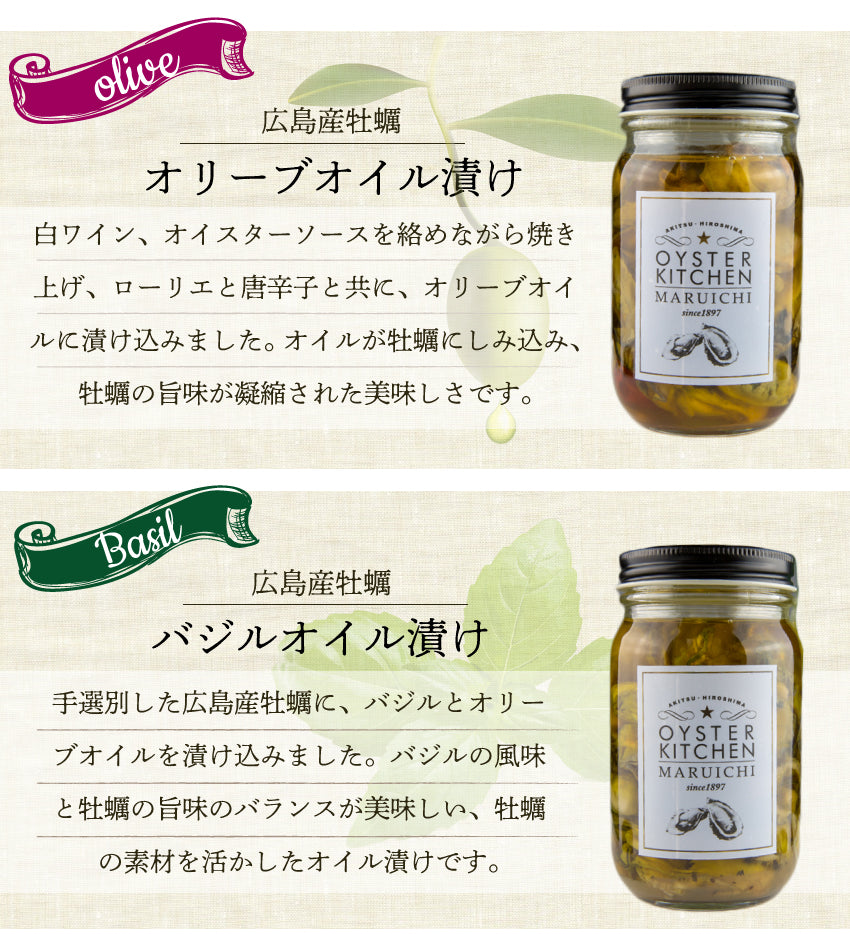 ■バジルオイル漬け ・内容量:200g ・原材料:かき(広島産)、オリーブオイル 白ワイン、食塩、こしょう、バジル ・賞味期限:製造日より90日 ・保存方法:涼しい冷暗所